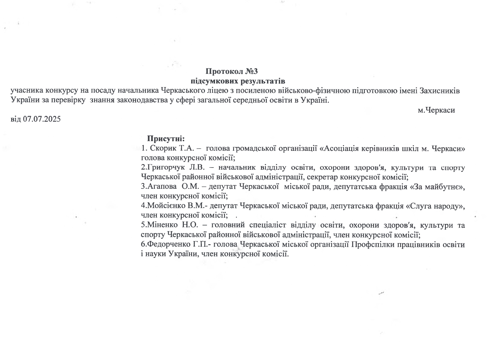 ПРОТОКОЛ №3 засідання конкурсної комісії департаменту освіти та гуманітарної політики з проведення конкурсу на посаду начальника Черкаського ліцею з посиленою військово-фізичною підготовкою