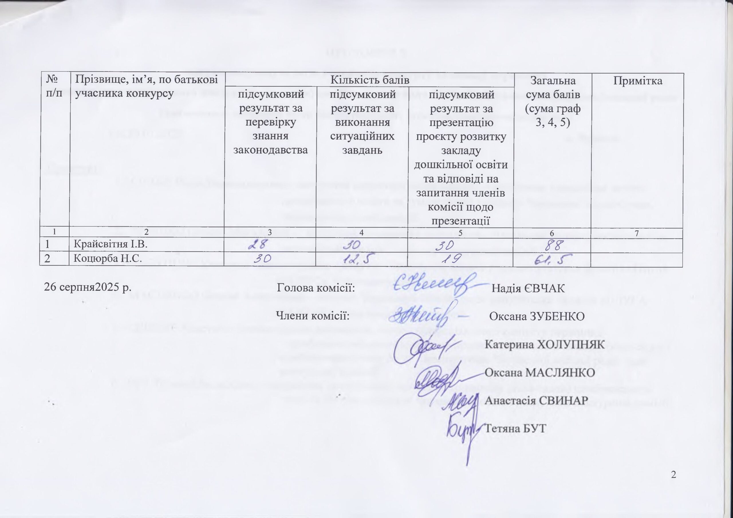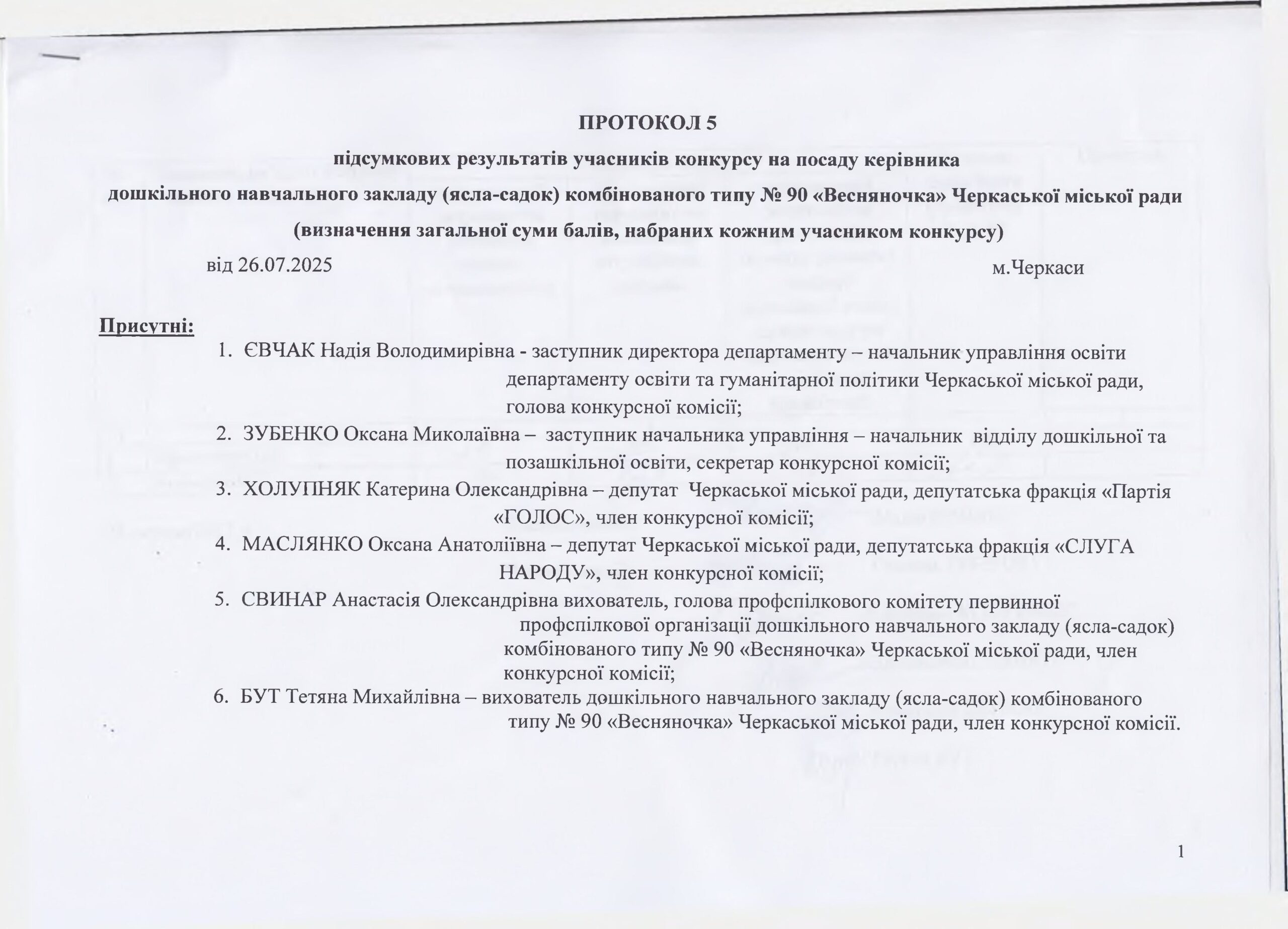 Протокол №5 підсумкових результатів учасників конкурсу на посаду керівника дошкільного навчального закладу (ясла-садок) комбінованого типу №90 “Весняночка” ЧМР (визначення загальної суми балів, набраних кожним учасником конкурсу).