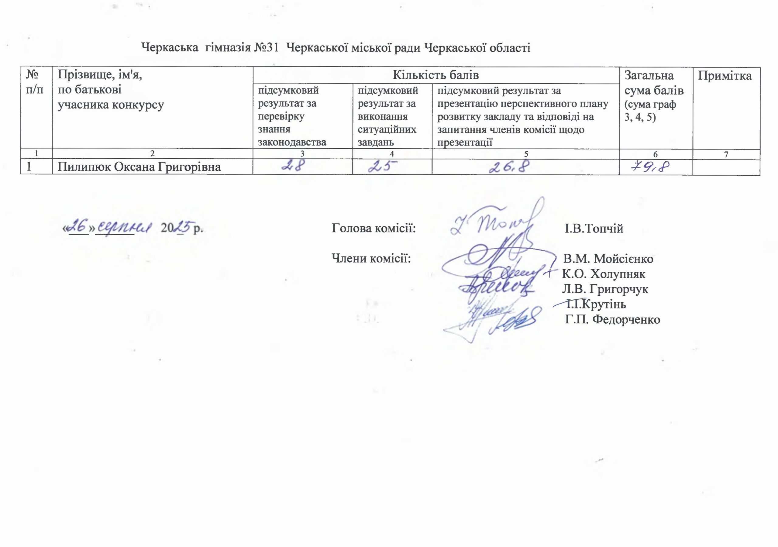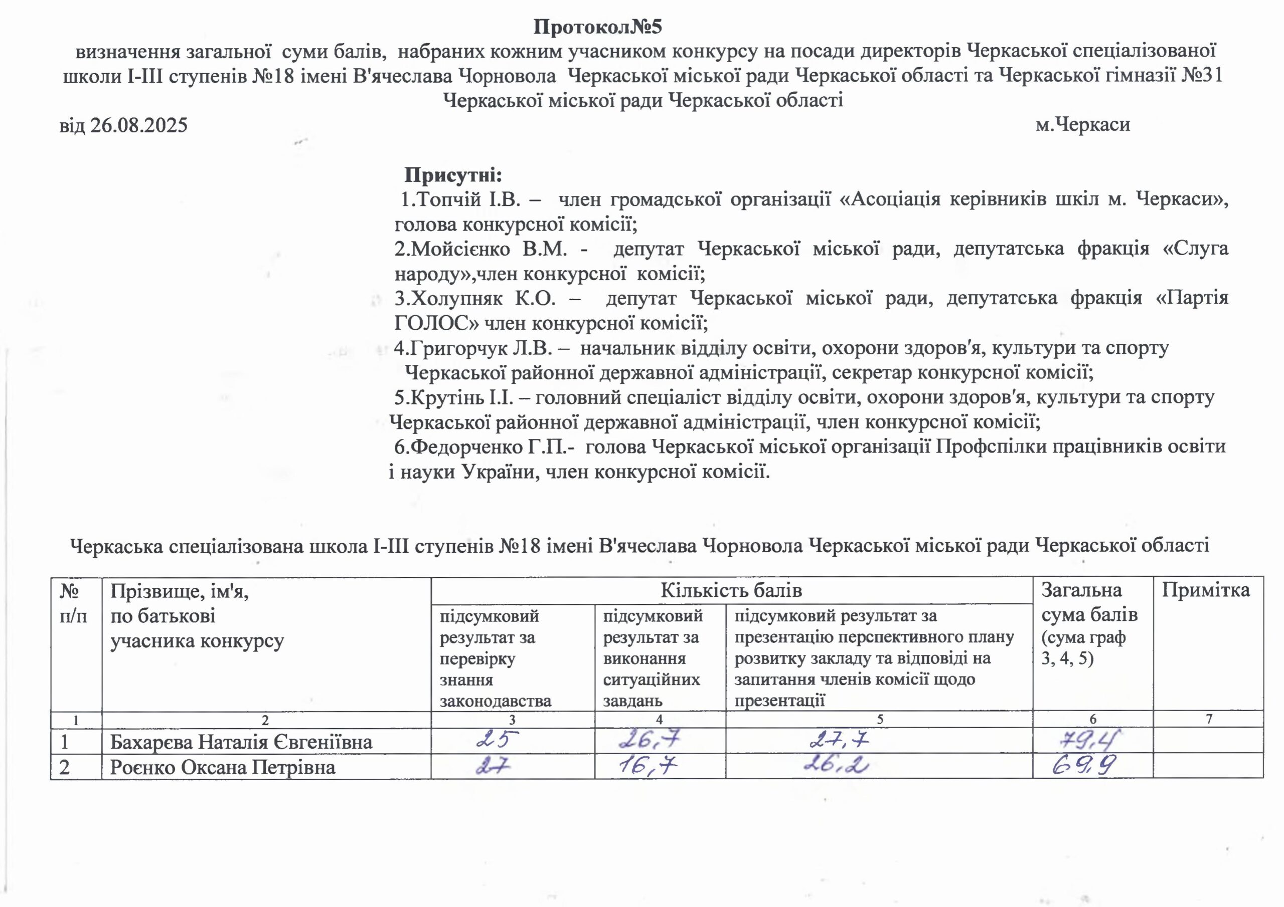 Протокол №5 визначення загальної суми балів, набраних кожним учасником конкурсу на посади директорів Черкаської спеціалізованої школи І-ІІІ ступенів №18 імені В’ячеслава Чорновола ЧМР Черкаської області та Черкаської гімназії №31 ЧМР Черкаської області.