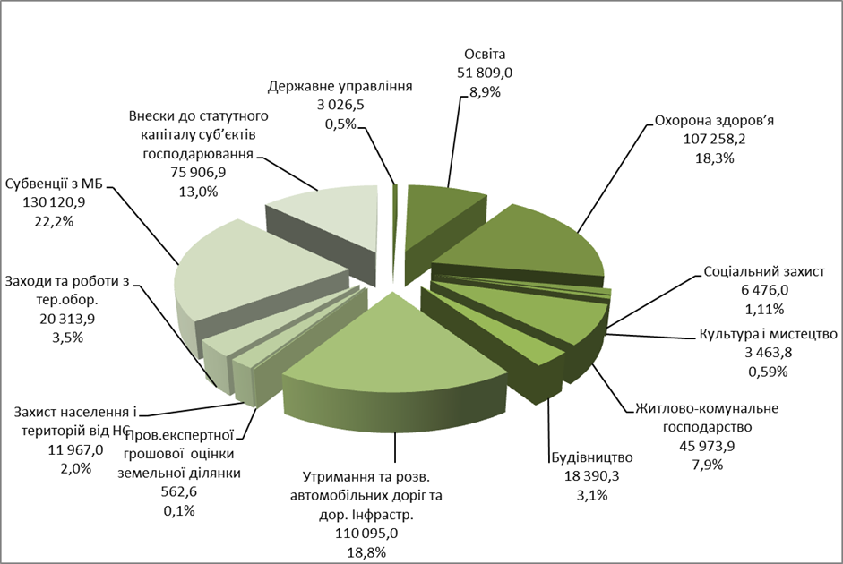 Видатки по загальному фонду бюджету склали 2 847 217,0 тис. грн, або 67,5 % до уточненого річного плану (з них за рахунок трансфертів з державного та обласного бюджету –460 500,0 тис. грн, або 72,3 % до уточненого річного плану);