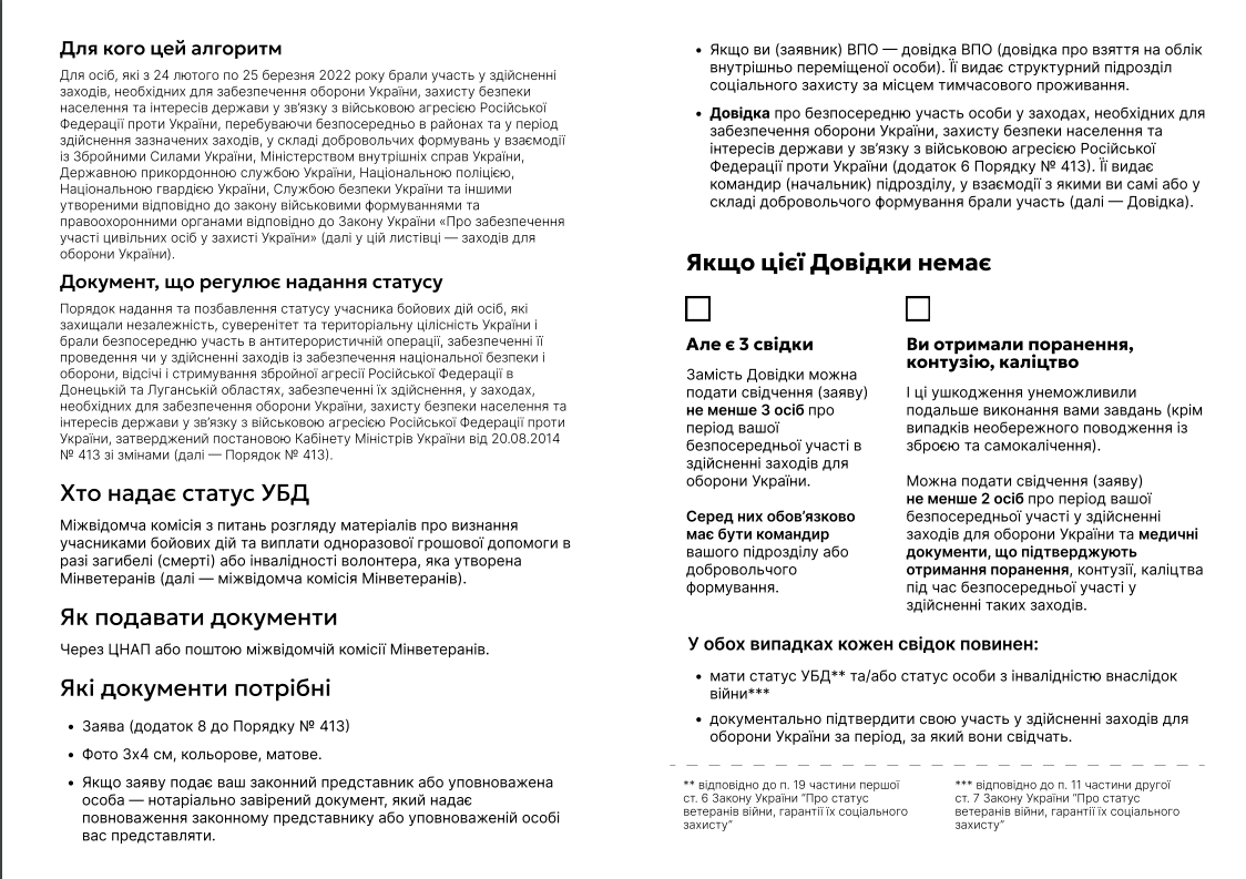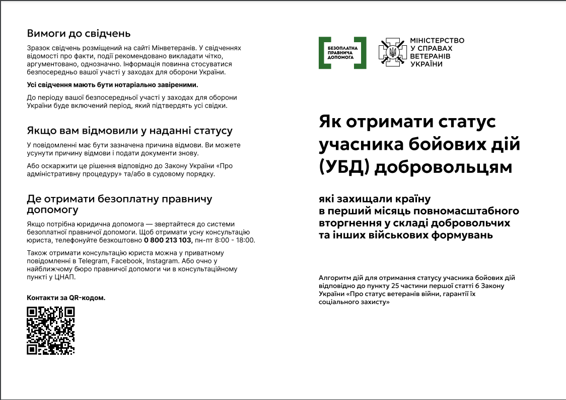 Міністерством у справах ветеранів України спільно з Координаційним центром з надання правничої допомоги підготовлено інформаційні матеріали щодо встановлення статусу учасника бойових дій особам, які з 24 лютого по 25 березня 2022 року відповідно до Закону України «Про забезпечення участі цивільних осіб у захисті України» або у складі добровольчих формувань у взаємодії із Збройними Силами України, Міністерством внутрішніх справ України, Державною прикордонною службою України, Національною поліцією, Національною гвардією України, Службою безпеки України та іншими утвореними відповідно до закону військовими формуваннями та правоохоронними органами брали участь у здійсненні заходів, необхідних для забезпечення оборони України, захисту безпеки населення та інтересів держави у зв’язку з військовою агресією Російської Федерації проти України, перебуваючи безпосередньо в районах та у період здійснення зазначених заходів.